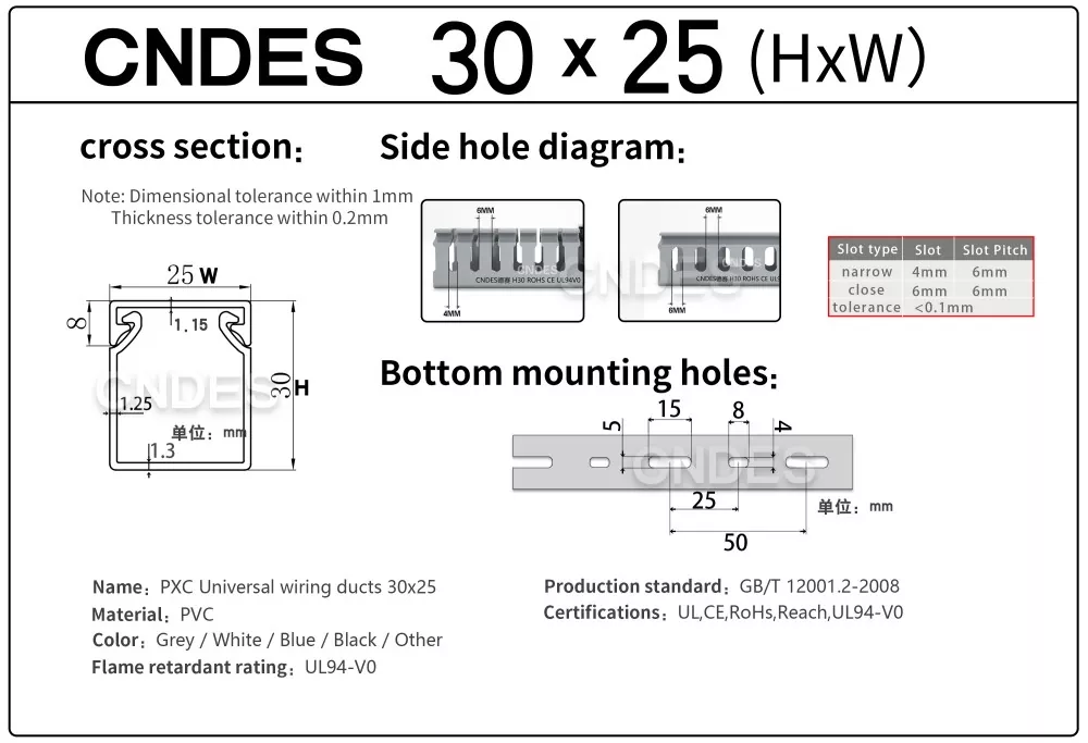 Jos etsit luotettavaa räätälöityä 30 × 25 uraa PVC-langan suojakanavien valmistajaa tai toimittajaa Kiinasta, CNDES on valmis tukemaan projektiasi tehtaan suoralla hinnoittelulla ja ammattitaitoisella palvelulla.