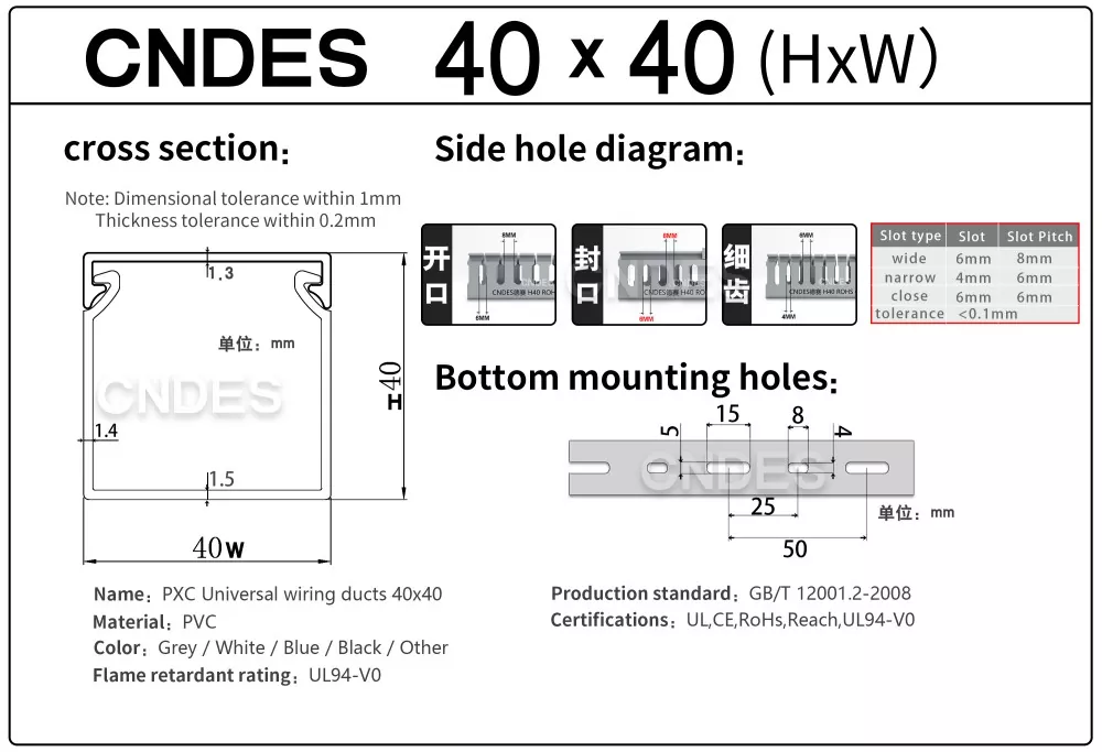 Voit olla varma, että ostat laadukkaan 40 × 40 PVC-johdotuskanavan kannella tehtaaltamme (CNDES). Korkeus 40 mm ja leveys 40 mm.