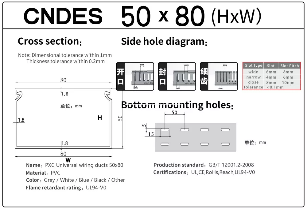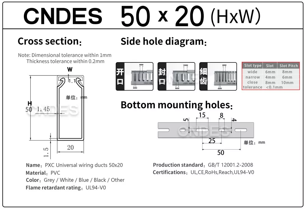 CNDES on valmistaja ja toimittaja, joka on erikoistunut uritetun PVC-paneelijohdotuskanavan toimittamiseen. Tässä esittelemme 50 mm korkean johtokanavamme, mukaan lukien seuraavat tiedot: 50*20,50*25,50*30,50*35,50*40,50*45,50*50,50*55,50*60,50*80,50*100.