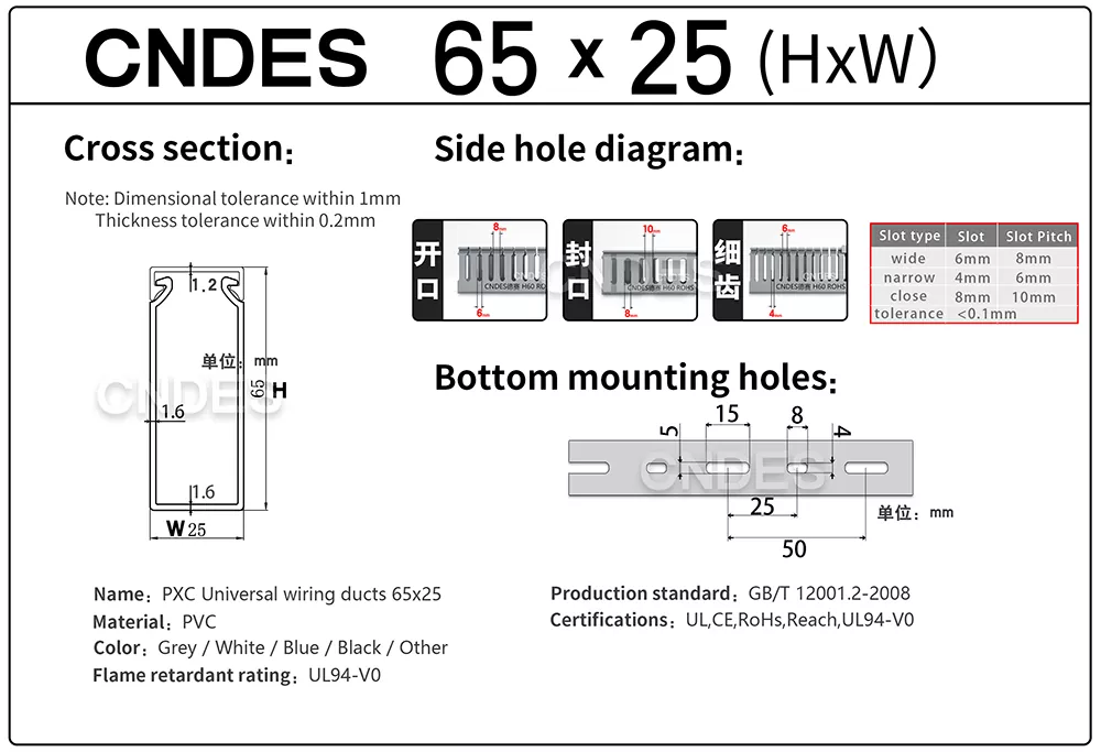 CNDESin räätälöidyt 65 × 25 Cable Tray Ducts on ohut kaapelinhallintakanava, joka on valmistettu jäykästä PVC:stä. Sitä käytetään pääasiassa ohjaamaan ja suojaamaan kaapeleita alueilla, joissa: