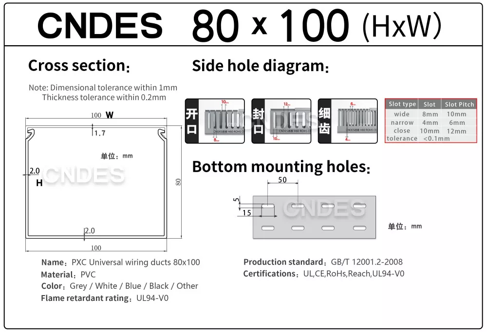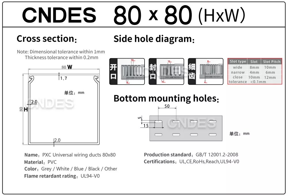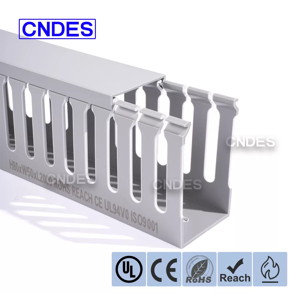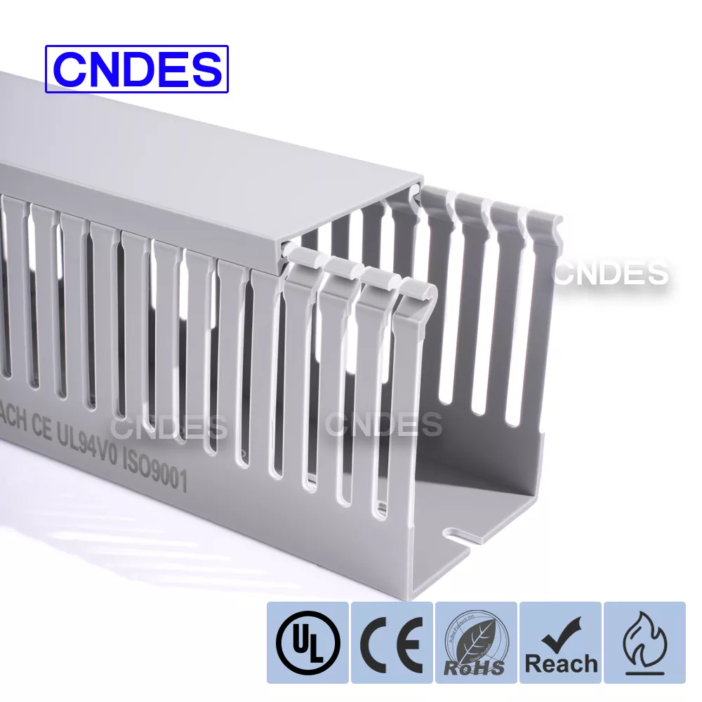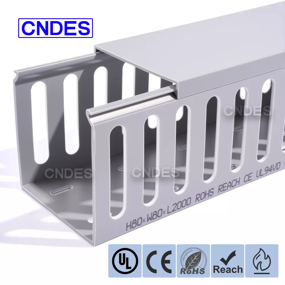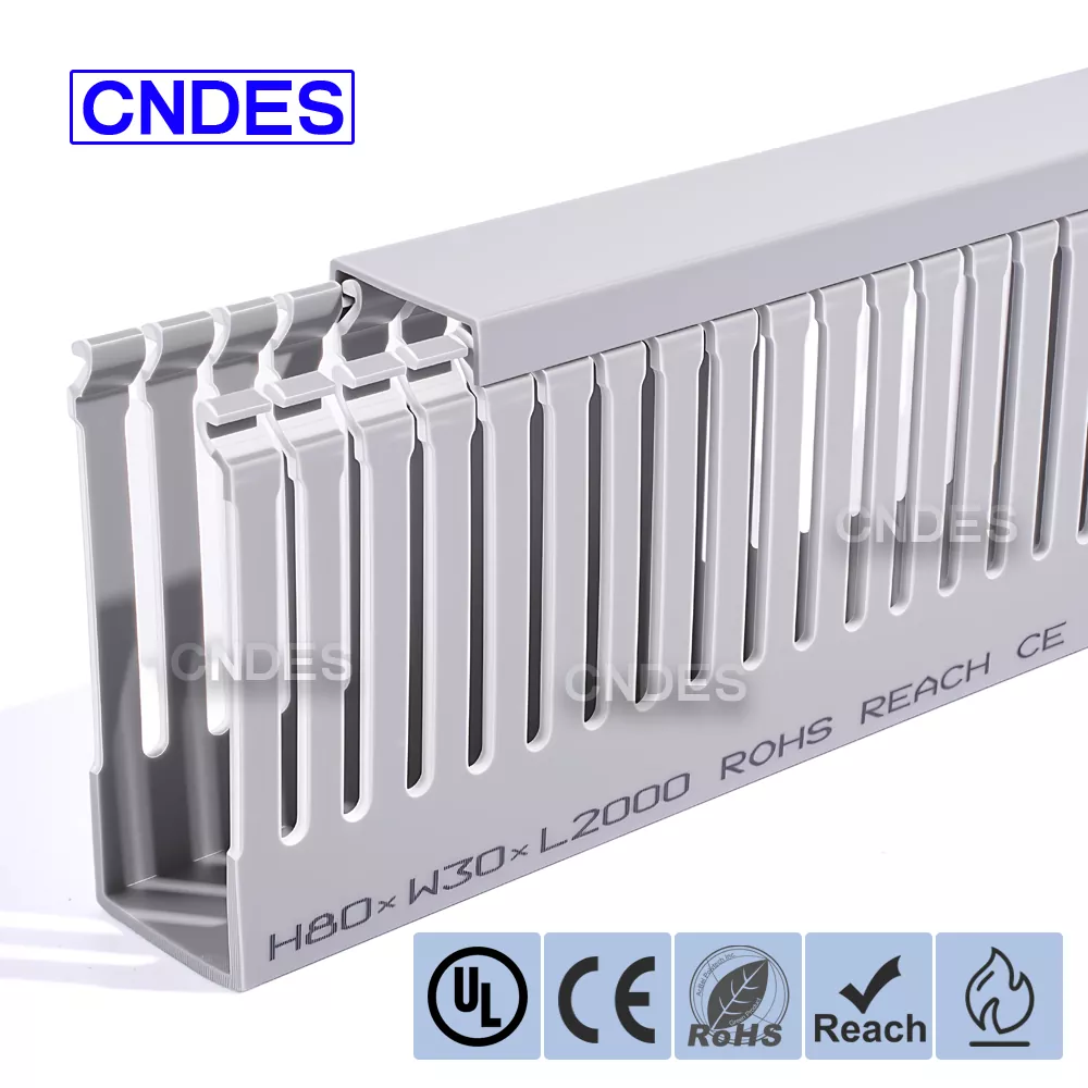 CNDES:n räätälöity 80 korkeus uralla varustettu PVC-automaatiokaapelikanava on suunniteltu tehokkaaseen kaapelinhallintaan teollisuusautomaatiojärjestelmissä. 80 mm:n korkeudella ja uritettu kanava tarjoaa runsaasti tilaa suuritiheyksisille johdotuksille ja pitää kaapelit järjestettyinä ja suojattuina monimutkaisissa ohjausjärjestelmissä, PLC:issä ja koneen johdotussovelluksissa.