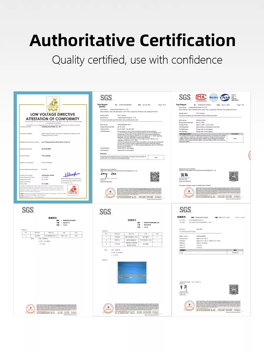 Johdotuskanavatuotteemme on läpäissyt UL-, CE-, ROHS-, REACH- ja UL94V0-sertifikaatit, mikä varmistaa sen laadun! Käytä luottavaisin mielin, osta mielenrauhalla.