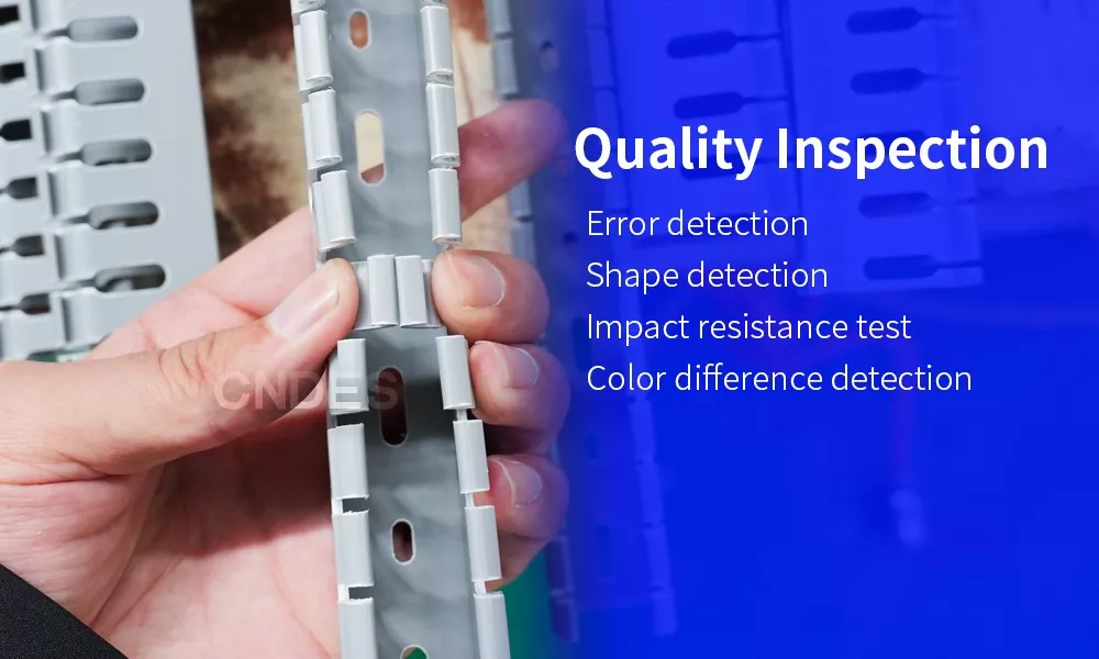 Korkeatasoinen laaduntarkastus on olennaista hyvien tuotteiden tarjoamiseksi. CNDES:llä laatutavoitteemme on loputon. Teemme kaikkemme tarjotaksemme asiakkaillemme luotettavia tuotteita. Meillä on neljä vuorotyötä laaduntarkastajaa suorittamassa tuotteidemme online-tarkastuksia. Tämä varmistaa, että laadukkaat 80 korkeudet uritetut PVC-automaatiokaapelikanavamme ovat neliön muotoisia, niillä on sileät pinnat ja ne täyttävät hyväksyttävät sitkeysstandardit,